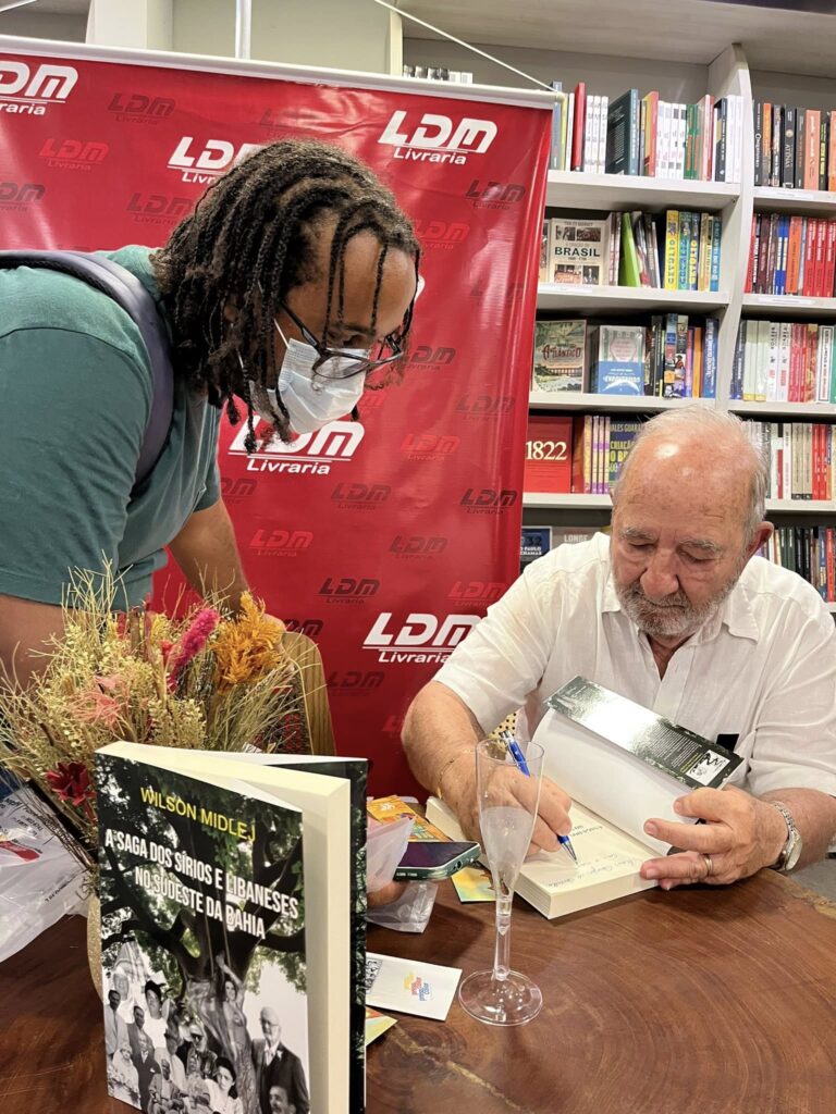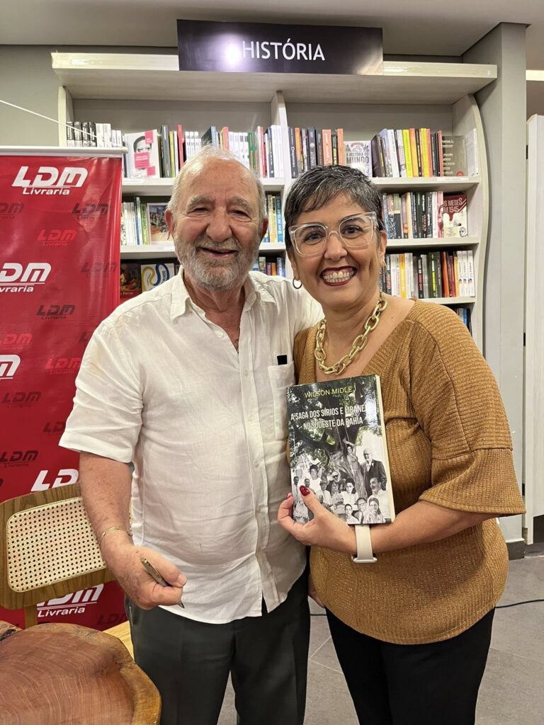 O cheiro do babaganoush se misturava ao das páginas recém-autografadas. Sobre uma mesa, pequenas tigelas de hummus, salada de feijão, muhammara e pão recebiam as mãos curiosas dos convidados, como se cada receita fosse uma lembrança. A noite de autógrafos de “A saga dos sírios e libaneses no sudeste da Bahia”, novo livro do jornalista, advogado e escritor Wilson Midlej, realizada nesta sexta-feira (17), na Livraria LDM do Shopping Bela Vista, começou antes mesmo da primeira palavra escrita: veio pelo olfato, pela memória, pelo cheiro de casa. O lançamento proporcionou uma experiência gastronômica para celebrar um trabalho que mistura apuro documental, narrativas de família e cuidado literário.