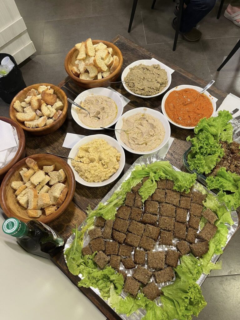 Na mesa dos petiscos, Jussara Midlej, que atuou como revisora técnica do livro, explicava a origem de cada receita. Aposentada da Universidade Estadual do Sudoeste da Bahia (UESB), a educadora ofereceu todo o suporte para o nascimento da Saga. “É a oralidade que alimenta nossa memória”, disse ela, sorrindo enquanto pegava uma porção generosa de muhammara, feita com pimentão assado e nozes. Quem também auxiliou no brilhantismo do cardápio foi o chef Nelmaron. Doutor em Odontologia, ele levou o elogiado quibeh alsamak (quibe de peixe).
