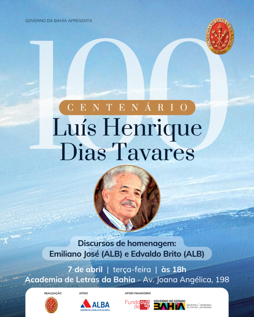 A Academia de Letras da Bahia (ALB) realiza, no dia 7 de abril, às 18h, uma sessão especial em homenagem ao centenário do historiador, jornalista e escritor Luís Henrique Dias Tavares. O evento, aberto ao público, acontecerá no Palacete Góes Calmon e reunirá acadêmicos, pesquisadores, jornalistas e convidados para celebrar a trajetória de um dos maiores intelectuais baianos do século XX.