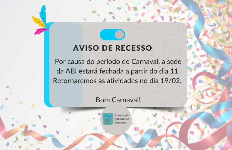 A sede da Associação Bahiana de Imprensa, situada na Praça da Sé – Centro Histórico de Salvador, estará fechada a partir desta quarta-feira (11), por causa do período carnavalesco. Retornaremos às atividades no dia 19/02.