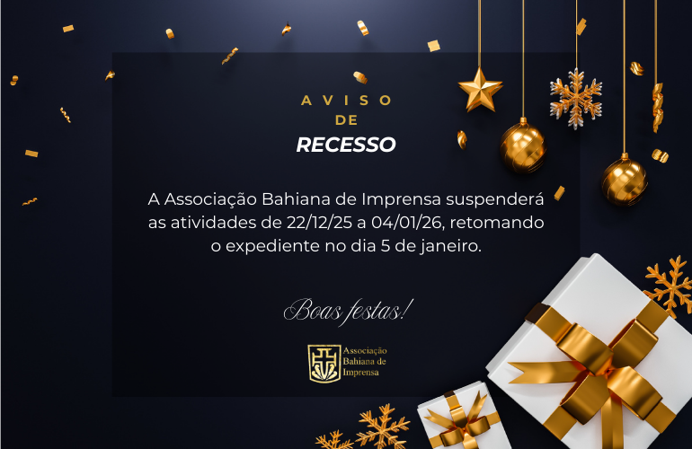 A Associação Bahiana de Imprensa entrará em recesso no período de 22 de dezembro de 2025 a 4 de janeiro de 2026, retomando suas atividades no dia 5 de janeiro (segunda-feira).