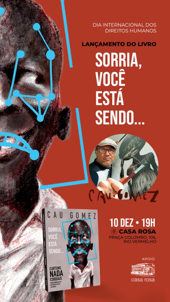 O cartunista Cau Gomez lança, nesta quarta- feira (10), às 19h, na Casa Rosa do Rio Vermelho, o livro “Sorria você está sendo…- Cartuns Nada Cordiais sobre racismos e outros absurdos”. A obra reúne cartuns, charges, caricaturas e ilustrações que abordam, com olhar crítico, questões relacionadas ao racismo, entre outras formas de violações de direitos. O evento se junta com a programação do Dia Internacional dos Direitos Humanos e é aberto ao público.