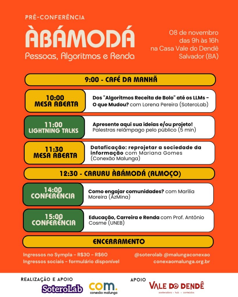 “Àbámoda” é o nome de uma folha utilizada em religiões de matriz africana. Em alguns textos essa folha também é conhecida como Folha da Fortuna, e seu nome em ioruba significa “o que você deseja, você faz”. Nesse contexto, a “Pré-conferência ÀBÁMODÁ: Pessoas, algoritmos e renda” chega como um movimento de realização e coletividade estimulando o debate-produção de tecnologias digitais de forma socialmente sensível, avaliando suas consequências por perspectivas de classe, gênero e raça.