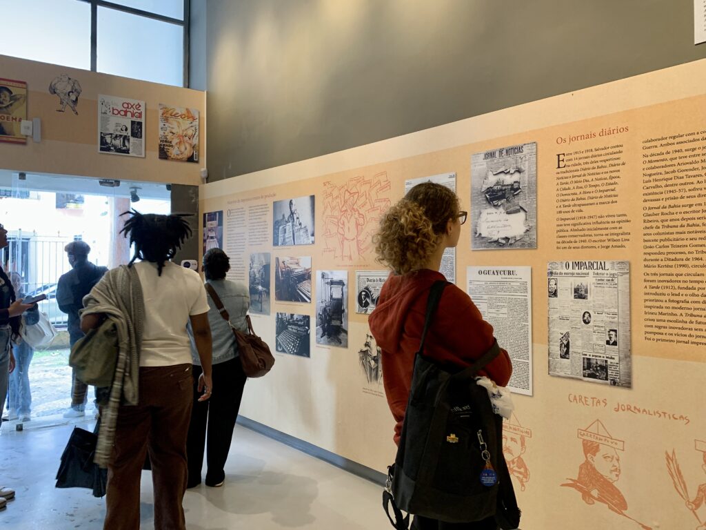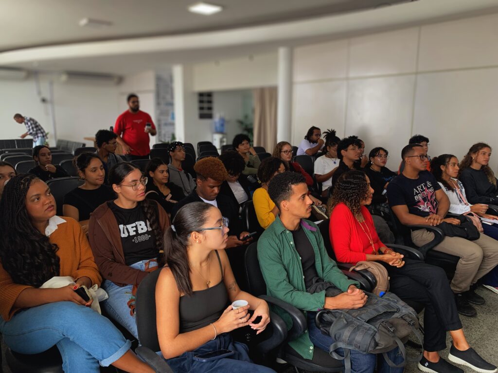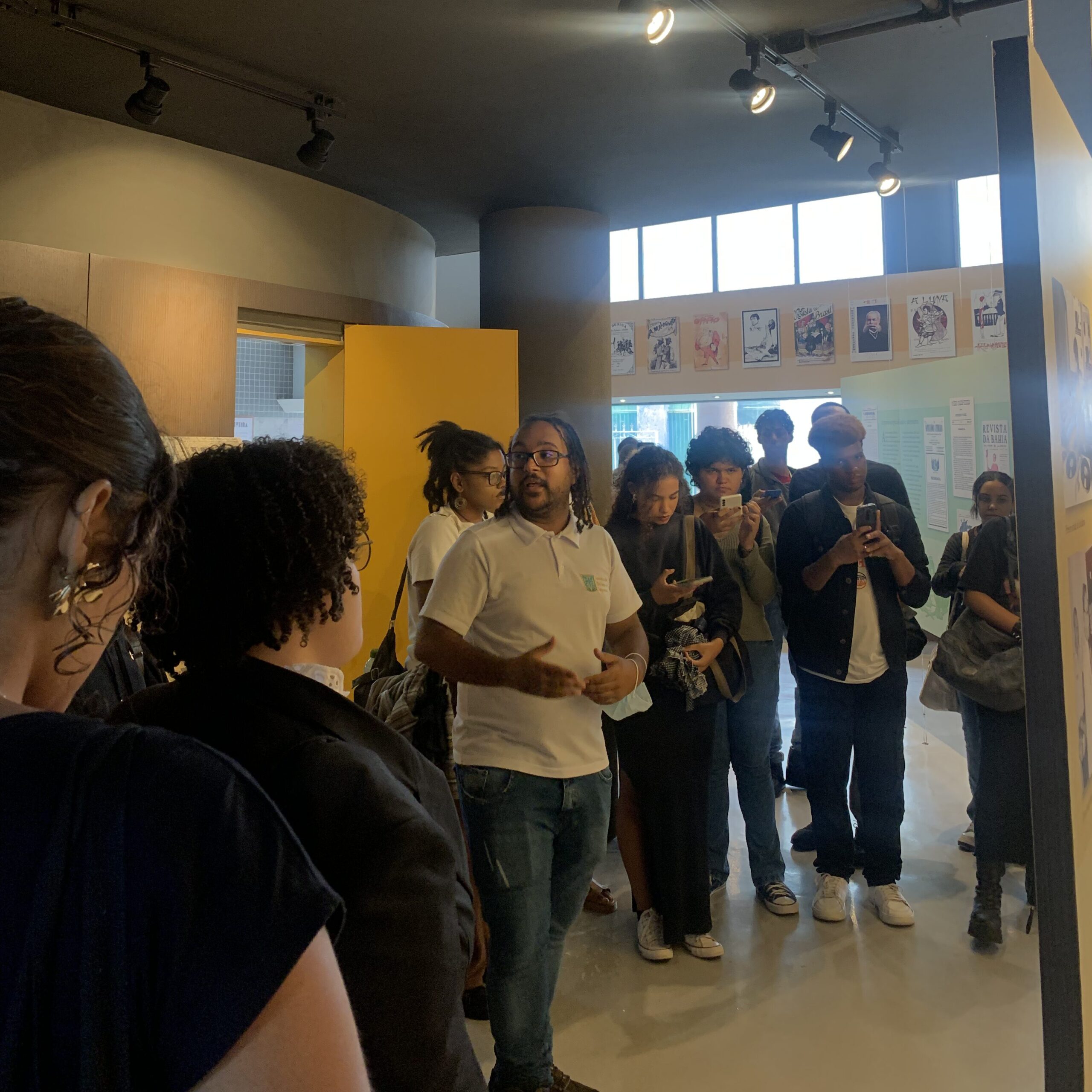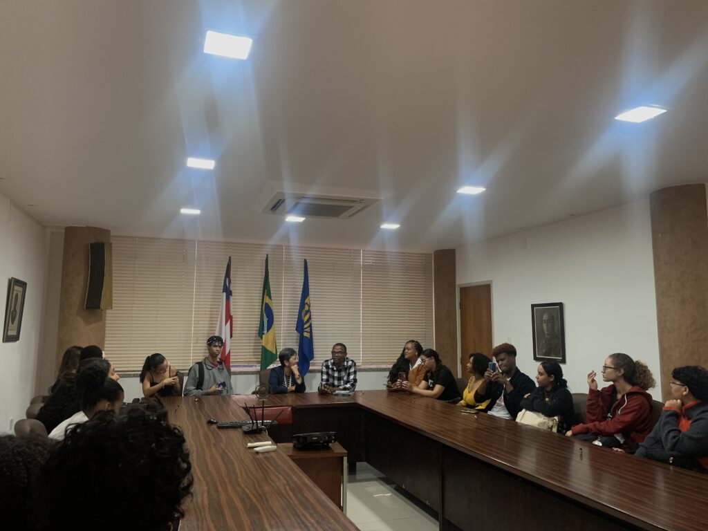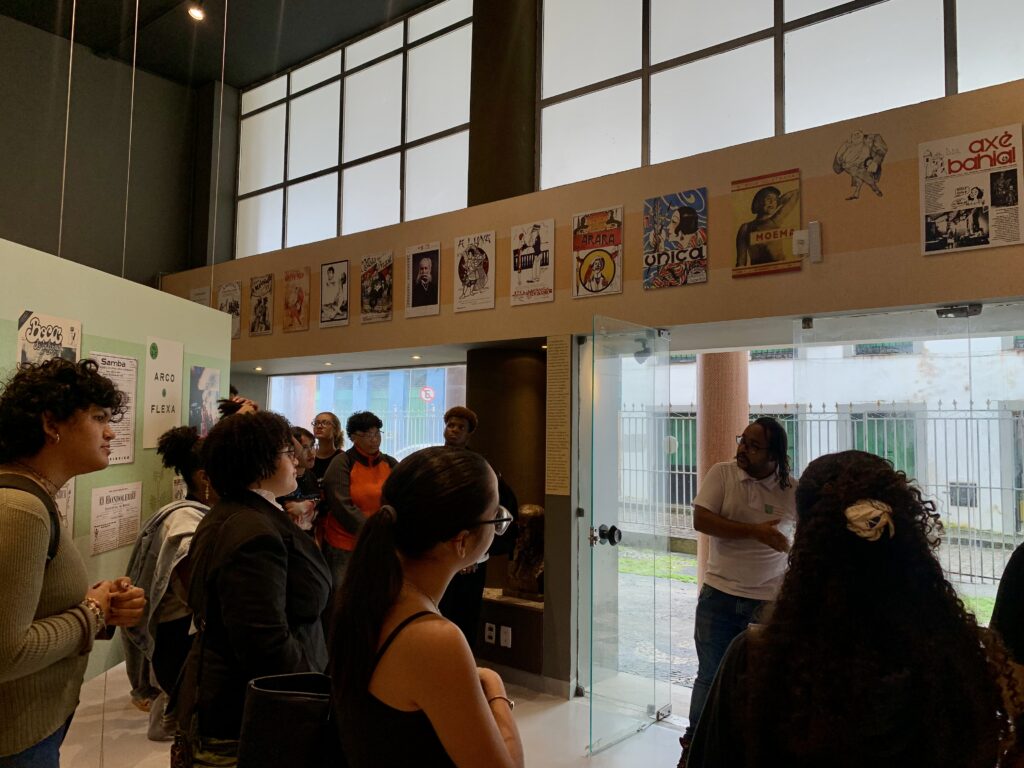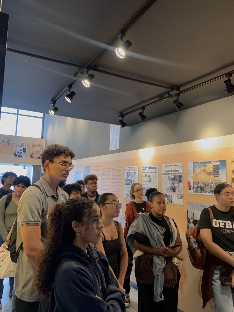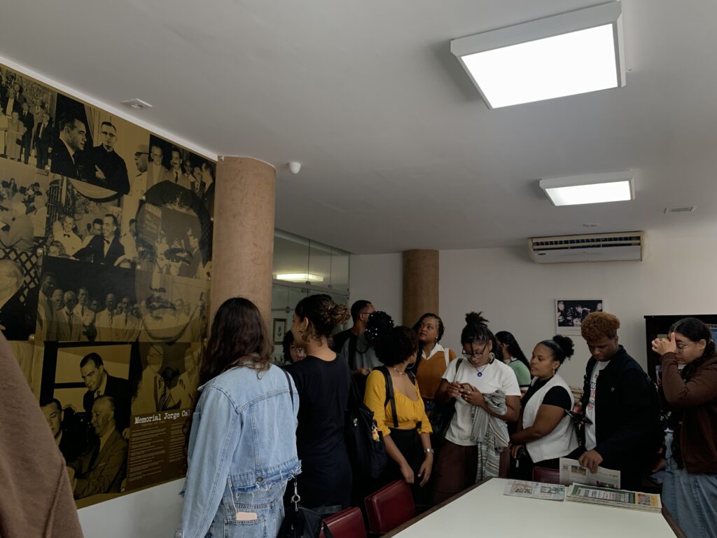 A visita seguiu com um passeio pela Biblioteca da ABI, onde os alunos conheceram o acervo histórico da instituição, composto por livros, periódicos e documentos raros sobre o jornalismo baiano.