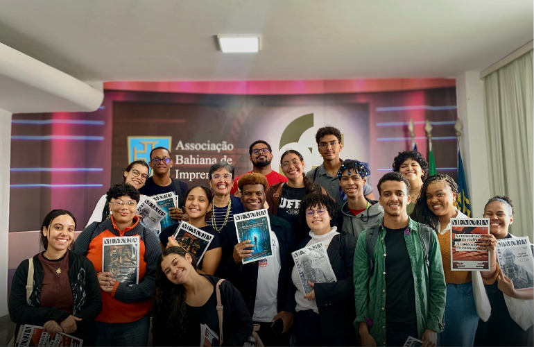 A visita seguiu com um passeio pela Biblioteca da ABI, onde os alunos conheceram o acervo histórico da instituição, composto por livros, periódicos e documentos raros sobre o jornalismo baiano.