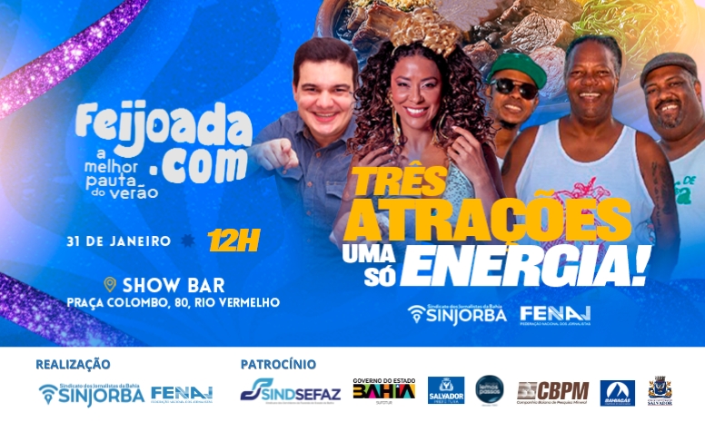 A Feijoada.Com 2026, evento promovido pelo Sindicato dos Jornalistas Profissionais da Bahia (Sinjorba), acontece no dia 31 de janeiro, no Show Bar, no Rio Vermelho. A entidade promete mais uma edição marcada por música, celebração e encontro dos profissionais da comunicação da Bahia.