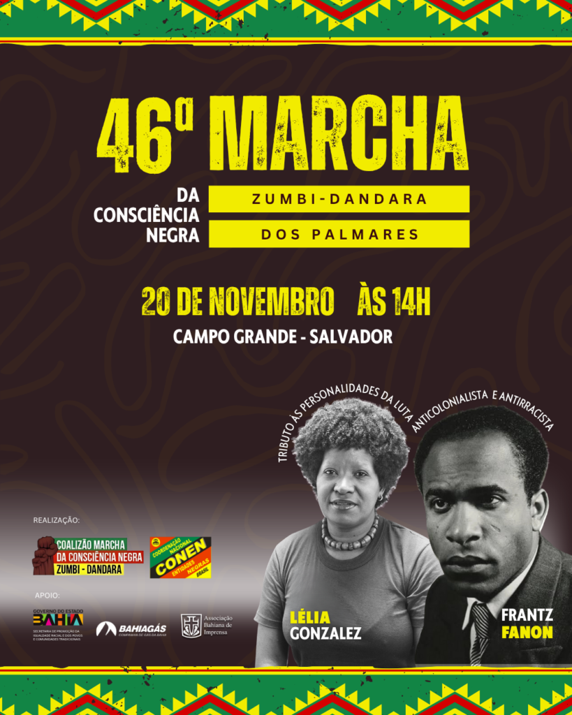 A 46ª Marcha da Consciência Negra Zumbi-Dandara dos Palmares toma as ruas do Centro de Salvador no dia 20 de novembro de 2025, a partir das 14h, fortalecendo um legado de resistência e mobilização que atravessa quase meio século de história. Organizada pela Coalizão Marcha da Consciência Negra Zumbi-Dandara e pela Coordenação Nacional de Entidades Negras (CONEN), a marcha é resultado de um processo político e educativo que se estende ao longo do ano, com seminários, oficinas e ações de base que reafirmam o protagonismo do povo negro na construção do Brasil.