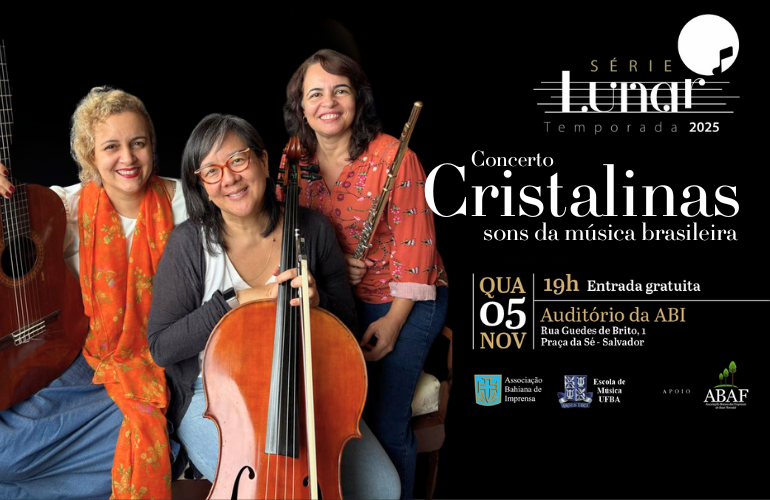 Na noite de 05 de novembro (quarta-feira), às 19h, o auditório da Associação Bahiana de Imprensa (ABI), localizado na Praça da Sé, recebe pela primeira vez o Trio Cristalinas, em mais uma noite da Série Lunar. Com o concerto gratuito “Trio Cristalinas: sons da música brasileira”, o grupo formado por Jana Vasconcellos (violão), Suzana Kato (violoncelo) e Gabriela Machado (flauta) vai explorar a riqueza e a diversidade da música instrumental brasileira em uma proposta autoral e contemporânea.